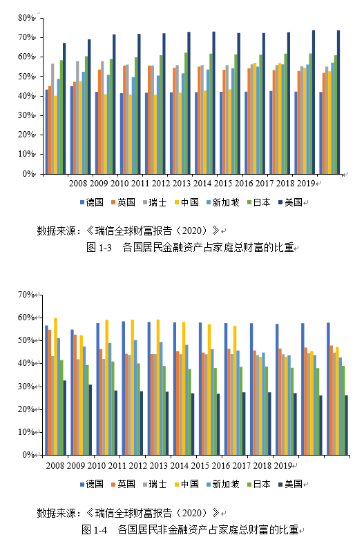 与其他国家相比,我国居民财富的配置结构存在显著差异(见图 1-3、图 1- 4)。我国家庭的金融资产配置比例远低于美国、日本家庭,也与西欧地区的瑞士、东南亚地区的新加坡存在差距。而非金融资产(房屋资产为主)占比却位居前列。美国等发达国家资本市场发达,财富管理机构运营经验丰富,理财产品种类繁多, 社会保障体系完善,居民对金融资产的投资偏好较高。而我国财富管理市场不够发达,金融产品种类、规模、交易机制不够完善,导致我国家庭可选金融产品规模小、品类少,不能满足日益增长的财富管理需求。同时,受传统理财观念以及商品房住宅市场近 20 年的超预期表现等原因的影响,我国居民习惯将购买住宅作为财富保值的首选,造成资产配置相对单一。