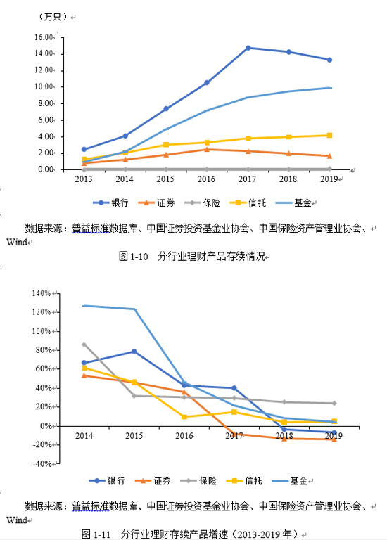 分行业来看,2013 年至 2019 年,基金业、保险业和信托业理财产品存续量呈不断增长趋势,银行业和证券业呈先增后减趋势,其中银行业理财产品数始终领跑各行业。从增速来看,各行业理财产品存续量同比增长不断减少,2018 年至