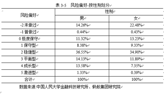 从性别来看,男性投资者的理财经验分布更加丰富,同时对风险的承受能力远远高于女性;女性投资者则以低理财意愿用户为主(见表 3-4 和表 3-5)。