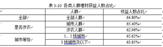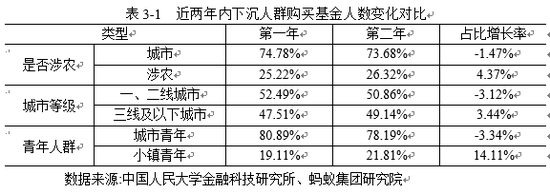 如表 3-1 所示,购买理财产品的用户当中,涉农的理财人数大约是非涉农人数的 1/3,但相比于第一年,涉农和所在城市等级较低的理财人数的占比在第二年均有所增长。这表明下沉人群中购买基金人数占比与其他人群中购买基金人数占比的差距正在缩小。同时,小镇青年理财人数的增长潜力要大于城市青年,在所有理财的青年人当中,小镇青年理财人数的占比较上一年有所上升。整体上讲, 互联网理财平台在拉动下沉人群参与理财市场方面产生了积极作用。