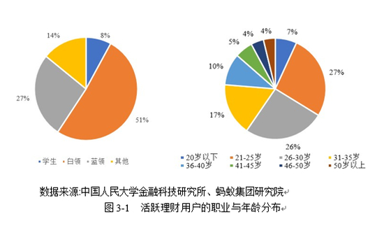 如图 3-1 所示,从职业分布来看,白领人群占比过半,其次是蓝领人群及学生群体。从年龄分布来看,占比排名前三位的年龄段分别为 21-25 岁、26-30 岁和 31-35 岁,表明青年人是购买理财的中坚力量。