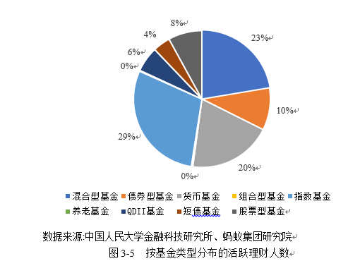 为进一步分析理财资产配置结构,我们将基金类理财产品划分为 BLEND(混合型基金)、BOND(债券型基金)、CURRENCY(货币基金)、FOF(组合型基金)、INDEX(指数基金)、PENSION(养老基金)、QDII(“合格境内机构投资者”基金)、SHORTDATED(短债基金)、STOCK(股票型基金)等九大类。整体上讲,投资指数基金的人数最多,占比接近 30%,这表明互联网理财人群对被动投资理念的接受度非常高;其次是混合型基金与货币基金,占比均超过 20%; 其他类型基金的投资人数均低于 10%,其中投资于养老基金及组合型基金的人数极少,不到 1%(见图 3-5)。