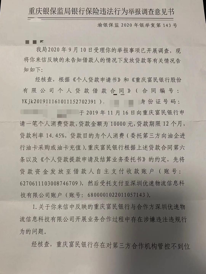 记者从受访者提供的资料获悉,目前重庆银保监局回复的一份银行保险违法行为举报调查意见书显示:经核查,重庆富民银行存在对第三方合作机构管控不到位等问题,我局将严格依法依规予以处理。同时该意见书显示,未发现证据证明重庆富民银行存在来信反映的“伙同第三方公司,采取欺诈手段骗取网民签订网贷合同”的问题。