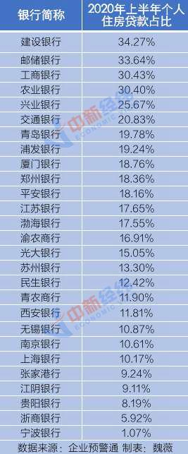 据企业预警通不完全统计,截至2020年上半年,国有六大行中,建设银行邮储银行的个人住房贷款占比分别为34.27%和33.64%,略高过第一档中32.5%上限。此外,兴业银行的个人住房贷款占比为25.67%,也高于第二档的20%上限。