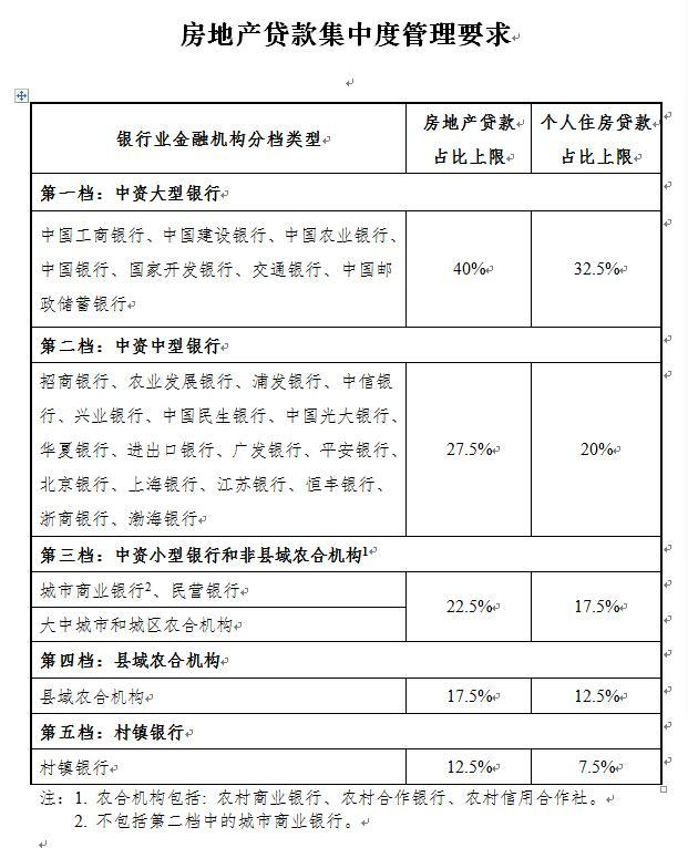 具体看,该通知将银行业金融机构分为五档,第一档为中资大型银行,包括工农中建交邮储和国家开发银行,房地产贷款占比上限为40%,个人住房贷款占比上限为32.5%;第二档为中资中型银行,包括农业发展银行、进出口银行2家政策性银行,12家全国性股份制银行以及北京银行上海银行和江苏银行3家城商行,房地产贷款占比上限为27.5%,个人住房贷款占比上限为20%。