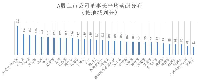 从地域来看,内蒙古和云南的董事长平均薪酬最高,原因在于此两地上市公司较少,而龙头企业伊利股份云南白药凭借一己之力拉高了所在区域的董事长们的平均薪酬,广东老板们的薪酬则普遍较高,不愧为“老板们的故乡”。