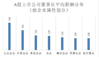 民营企业和地方国企的上市公司董事长平均年薪最低,均为108万元;其次为集体企业,董事长平均年薪116万元;央企上市公司的董事长们平均年薪129万元;其他企业(实控人为大学、其他、职工持股会、工会等)董事长平均薪酬133万元;外资企业董事长平均薪酬181万元。