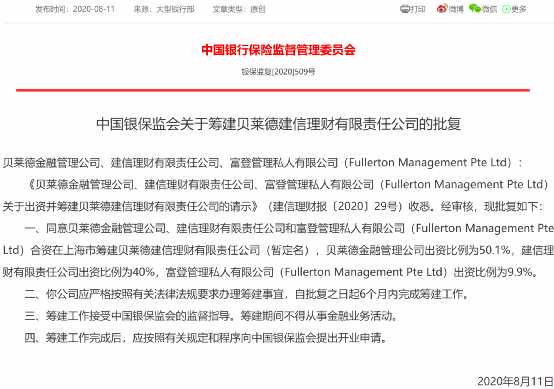 在2020年8月,银保监会官网就发布了“关于筹建贝莱德建信理财有限责任公司的批复”,同意贝莱德金融管理公司、建信理财有限责任公司和富登管理私人有限公司(Fullerton Management Pte Ltd,淡马锡旗下公司)合资在上海市筹建贝莱德建信理财有限责任公司(暂定名)。按照相关规定,贝莱德建信理财有限责任公司须自批复之日起6个月内完成筹建工作。