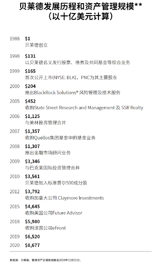 贝莱德是全球最大的资产管理公司,数据显示,截至2021年3月31日,贝莱德在全球管理的资产规模达到9万亿美元(约等于人民币58万亿元),涵盖股票、固定收益投资、现金管理、另类投资、房地产及咨询策略。贝莱德在全球超过30个市场,聘请约14,000位专业人士。贝莱德提供多种类型的投资方案,既有精准基本面与技术面的主动式管理,也有高效率的指数型策略,包括知名的iShares安硕ETF。