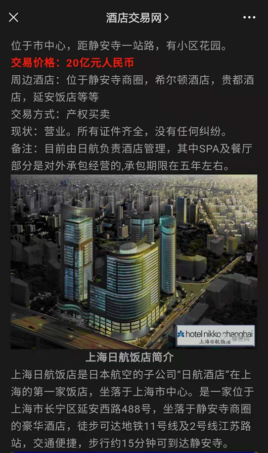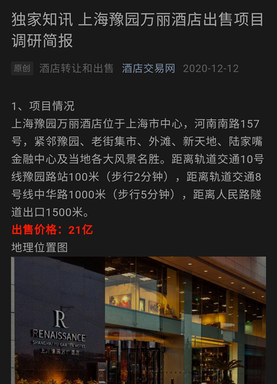 记者在一些全国性的酒店投资交易平台浏览发现,距今最近大约5、6个月前,已有上海虹桥绿地酒店群、上海新华联索菲特大酒店、上海豫园万丽酒店、上海日航酒店等多家上海五星级酒店的出售信息,项目出售调研报告也对外界披露。