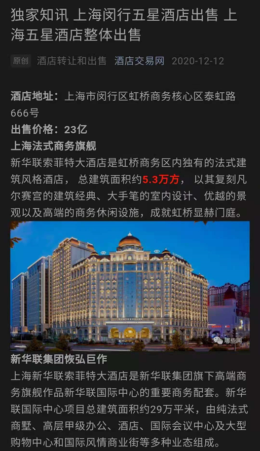以上海新华联索菲特大酒店为例,去年12月在酒店交易网挂出来时,转让价格为23亿元。作为新华联集团旗下高端商务旗舰作品以及新华联国际中心的重要商务配套,这家酒店开业于2017年,占地5.37万平方米,距今只有4年时间。