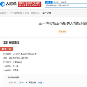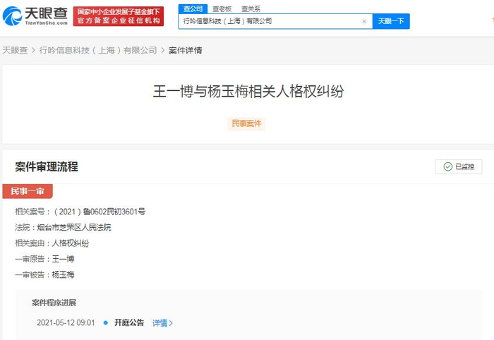 5月13日消息,天眼查APP显示,近日,行吟信息科技(上海)有限公司(小红书关联公司)公开王一博与杨玉梅相关人格权纠纷开庭公告,相关案号(2021)鲁0602民初3601号,审理法院烟台市芝罘区人民法院,一审原告为王一博,一审被告为杨玉梅,该案件已于2021年5月12日开庭。