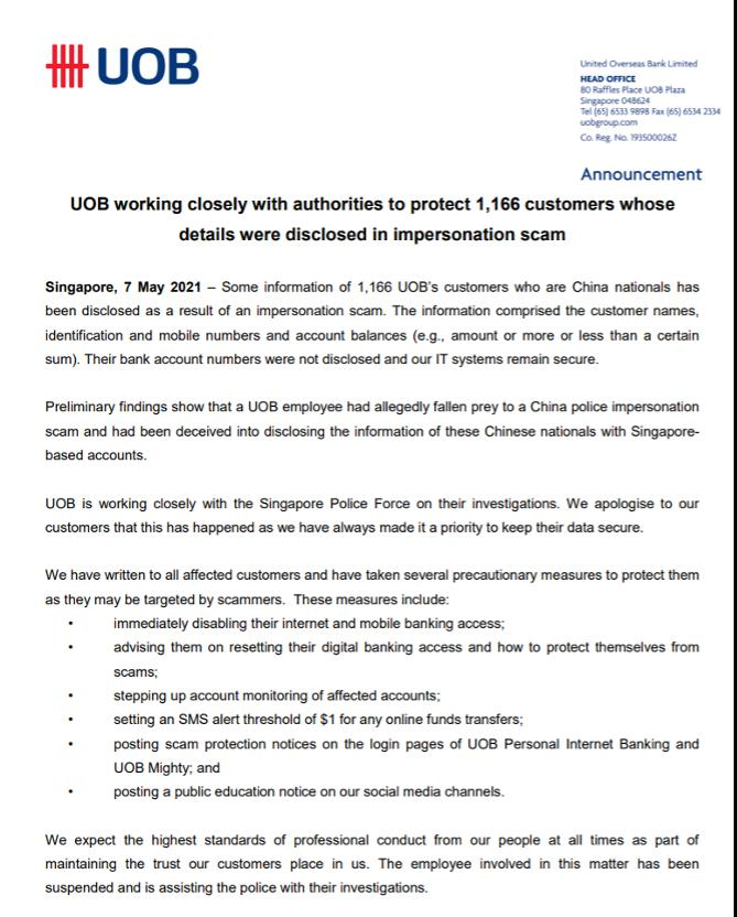 5月7日,新加坡大华银行对一起涉及1166名中国客户的信息泄漏事件在官网公开致歉。