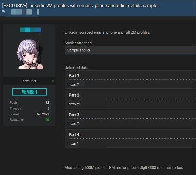 据公开信息,4月7日,拥有超7亿注册用户的职场社交平台LinkedIn遭遇了大规模的数据泄露事件。一名用户在黑客论坛上出售其获取的5亿LinkedIn用户的数据包,并“贴心”地无偿公开了200万条数据作为证据。4月10日,另一名用户也在同一黑客论坛中出售新的LinkedIn用户数据,并声称价值7000美元的比特币。Cybernews报道称,泄露的数据中包括用户的名字、电子邮件地址、电话号码、工作场所信息等。浏览LinkedIn网站可以发现,虽然用户的名字及工作经历为公开信息,但电话号码及邮件地址仍属于非公开信息。同时,根据黑客提供的数据示例来看,数据来源就是爬虫。