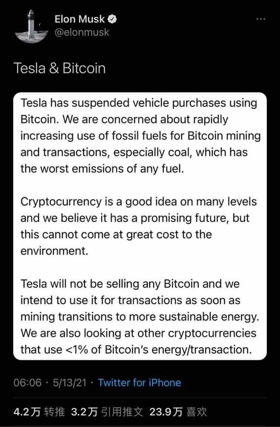 从马斯克开始关注比特币,他每条关于数字货币的推特几乎都会影响币价。就在今天早些时候,马斯克发布了特斯拉暂停接受比特币支付的消息,原因是比特币挖矿不环保。此推一出,不到两小时的时间里,比特币跌了约10%。