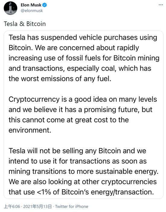 5月13日,马斯克在推特上宣布,特斯拉暂停接受比特币作为支付方式。