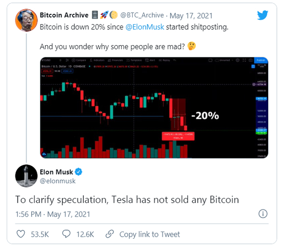 在这条推特下,马斯克评论道:“确实”。这一言论被市场解读为:马斯克在暗示特斯拉可能已经全部抛售或部分卖出了其比特币持仓。于是,比特币又开启暴跌模式,盘中一度重挫6000美元/枚,最低跌至42212美元,24小时内跌幅超过10%,其他加密货币也纷纷跟跌。