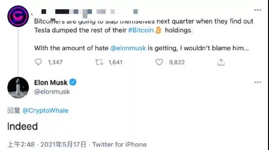 北京时间5月17日凌晨,马斯克在一条推特中暗示,特斯拉可能已出售其持有的剩余比特币。当时,一自称加密货币分析师的用户在推特上表示,“当他们在下个季度发现特斯拉已出售剩余的比特币持仓时,比特币持有者可能会扇自己耳光。”