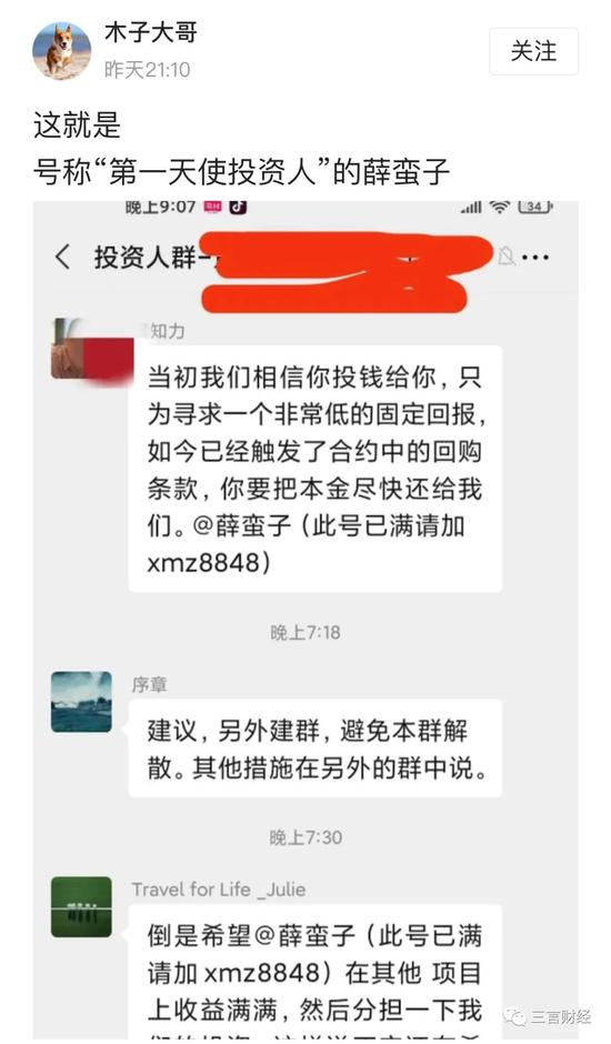 在投资者群中,众多投资者@薛蛮子,希望对方履行合同。不过据投资者称,薛蛮子消极回避,没有给出解决方案。
