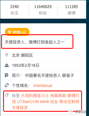 但是薛蛮子还懂得经营之道,他参加了微博的打拐活动,身上多了一个“微博打拐发起人之一”的标签,粉丝迅速飙升到200万。