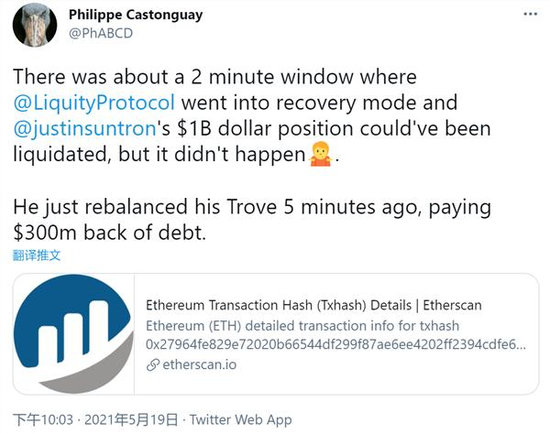 据推特账号Philippe Castonguay爆料,借贷平台LiquityProtocol 还差2分钟就将清算孙宇晨的60.6万个以太坊,这些以太坊价值10亿美元,在非常紧急的时间内,孙宇晨使用稳定币进行偿还,这些稳定币价值3亿美元,才使得这场清算没有触发。中国最大的比特币矿池创始人神鱼评价称“要是以太坊再跌100多,今晚估计就1000刀以内见”。