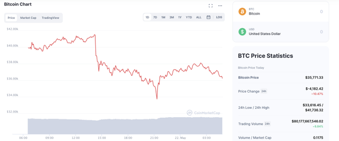 “披萨节”前夜,刚回到41000美元上方的比特币下破多个关口,在22日5时跌至33000美元左右,较七个小时前,波动幅度达到20%。