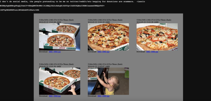 Laszio Hanyecz当时晒出了披萨的照片,此后曾提示,他并不用社交账号,有人在社交平台装作是他求比特币捐赠的是诈骗犯。