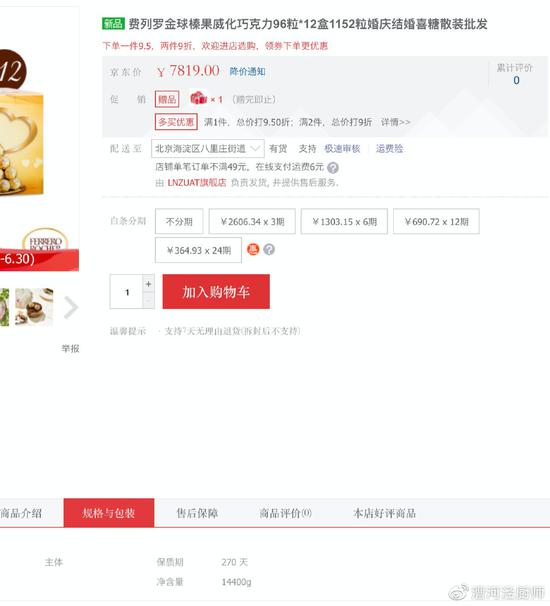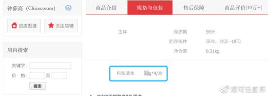 通过钟薛高京东官店的规格页面可知(蓝框部分),每支钟薛高含包装78g,那么照上面的逻辑,按最大价值算,2万支的重量(实际上是不可能的)是2万 X 78g,就是1.5吨,我们丧心病狂地全按120万/吨来算,成本顶天是120 X 1.5,就是180万人民币。