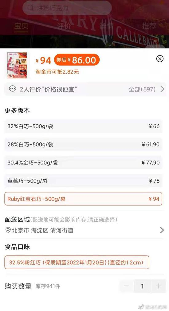 于是我赶紧去学习了下,大概了解到,这种粉色可可豆,是近年来才第一次被做成粉色的巧克力,第一个做成的是一个还蛮有名的巧克力品牌,叫百乐嘉丽宝。从钟薛高那个66块雪糕的英文别名种的Ruby大致也能看得出这个关系。