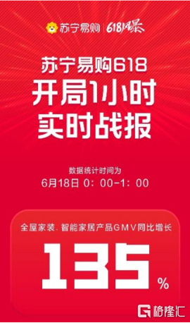 开局1小时战报,苏宁易购全屋家装、智能家居产品持续热卖,销售同比增长135%;苏宁奥莱奢品同比增长176%;酒水销售同比增长达到79%;首次参战618的苏宁药房1小时内GMV环比增长210%。