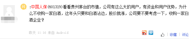 有些急坏的投资者甚至纷纷“支招”。比如,有的投资者提议称,险企可以考虑收购白酒企业,因为“这年头只要和白酒沾边,股价就涨”。