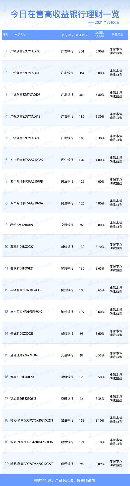 7月6日在售高收益银行理财产品:今日业绩比较基准在5%以上的银行人民币理财产品共5款。广发银行的“广银创富ZZGYCA0606”业绩比较基准最高,为5.9%。