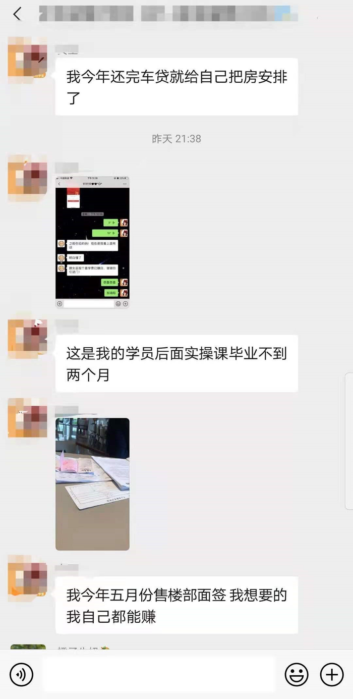 还有授课老师晒出学员的对话截图“学费已赚回,谢谢你引进门”。有的授课老师则营造出一个赚钱的形象称,“我今年还完车贷就给自己安排了房子,今年5月份售楼部面签,我想要的自己都能赚”,还附上了面签照片。显然,这些潜台词透露的信息都是学员若继续学习理财,就能赚更多钱。