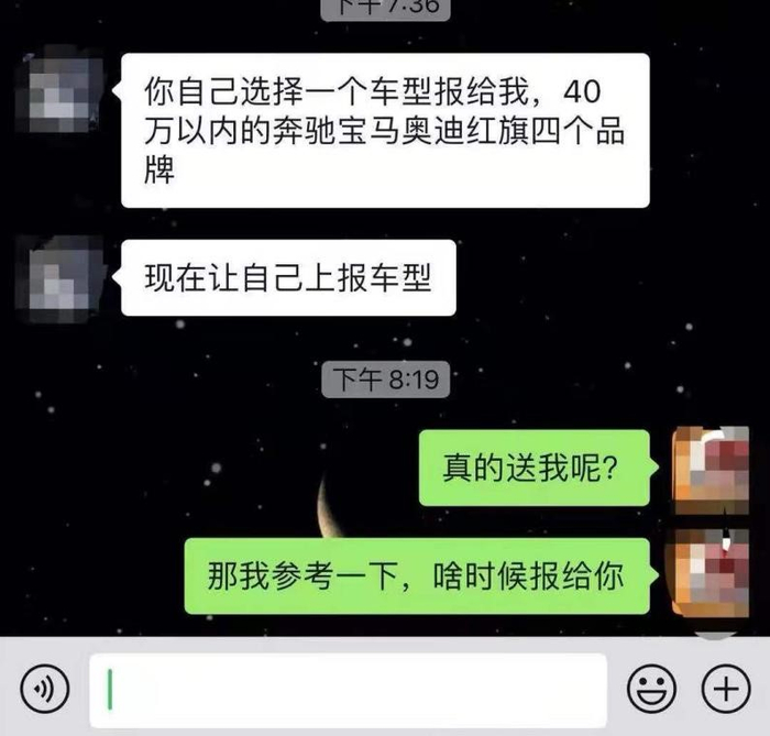 不过在微信群中,授课老师依然有吸引学员的招数,比如时不时晒出高额收益,甚至有授课老师提到“我的一个往期学员跟了我一年多赚了不少,现在让我选”,并晒出一张对话截图,对话大致内容是该学员要给这位老师送一辆40万元以内的车,让“老师”选择。