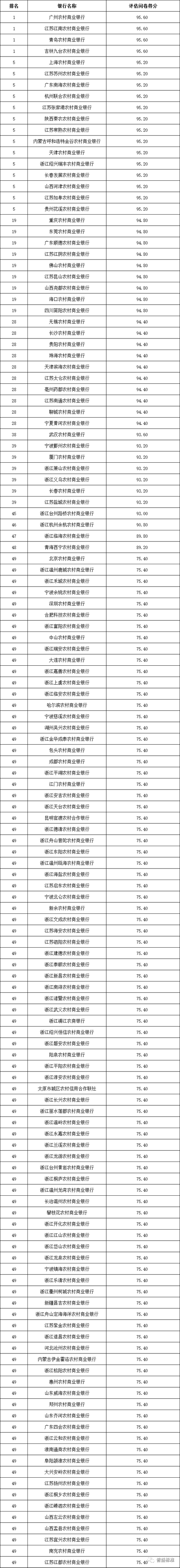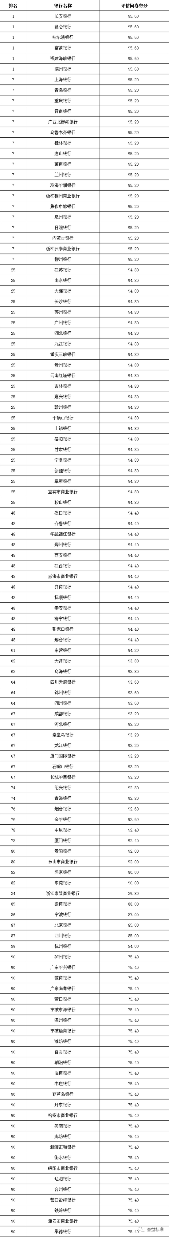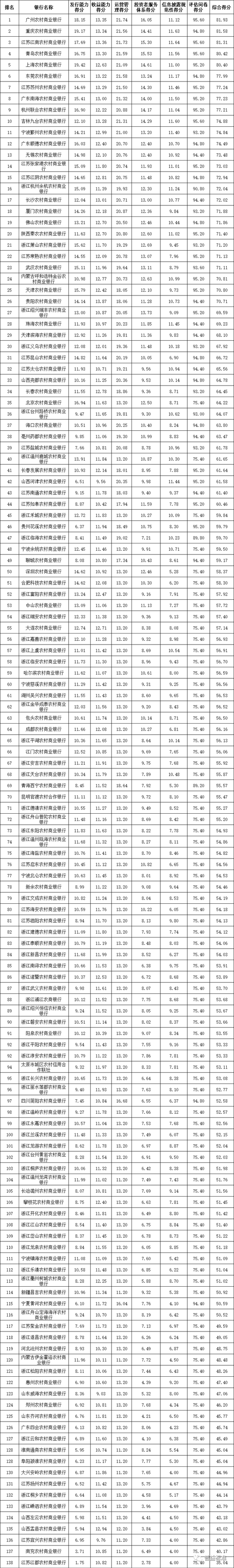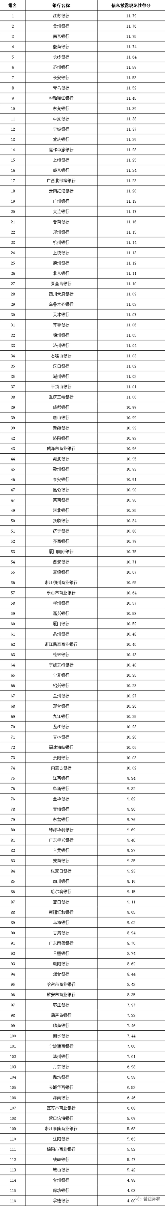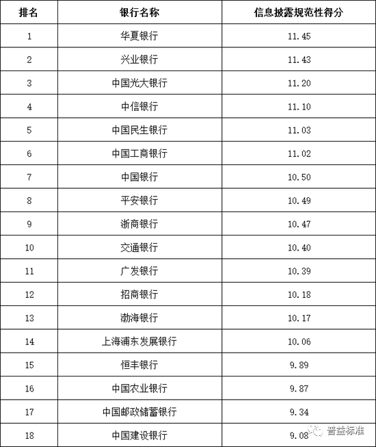 信息披露规范性:全国性银行排名前五的依次为华夏银行、兴业银行、中国光大银行、中信银行和中国民生银行;城市商业银行排名前十的依次为江苏银行、贵州银行、南京银行、徽商银行、长沙银行、苏州银行、长安银行、青岛银行、华融湘江银行和东莞银行;农村金融机构排名前十的依次为江苏江南农商银行、重庆农商银行、吉林九台农商银行、青岛农商银行、广东南海农商银行、江苏苏州农商银行、珠海农商银行、山西河津农商银行、宁波鄞州农商银行和浙江杭州余杭农商银行。