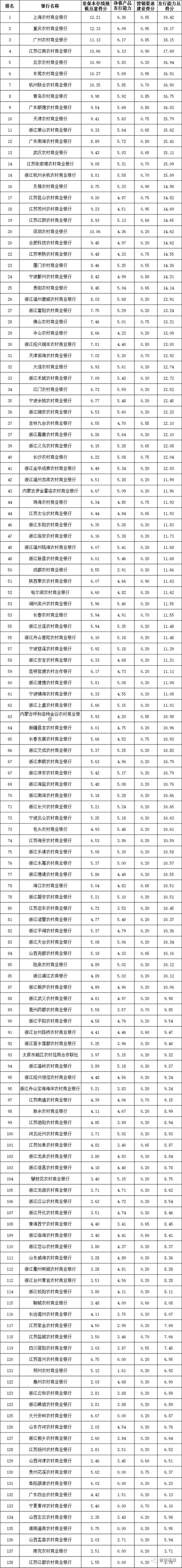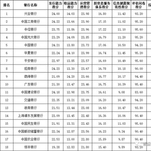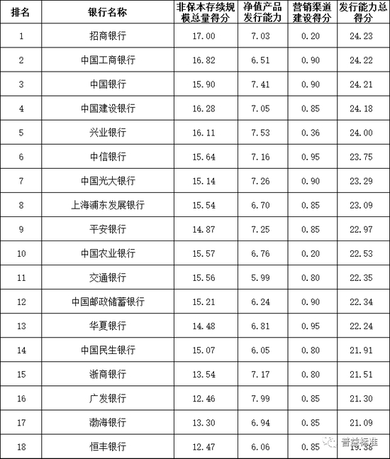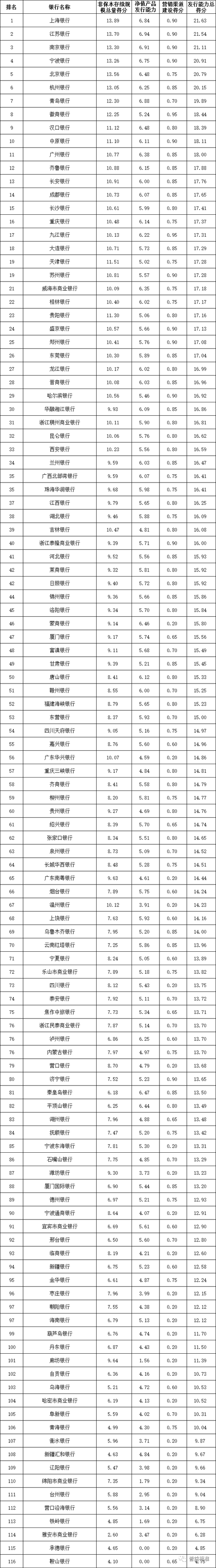 发行能力:全国性银行排名前五的依次为招商银行、中国工商银行、中国银行、中国建设银行、兴业银行;城市商业银行排名前十的依次为上海银行、江苏银行、南京银行、宁波银行、北京银行、杭州银行、青岛银行、徽商银行、汉口银行、中原银行;农村金融机构排名前十的依次为上海农商银行、重庆农商银行、广州农商银行、江苏江南农商银行、北京农村商银行、东莞农商银行、杭州联合农商银行、青岛农商银行、广东顺德农商银行和天津农商银行。