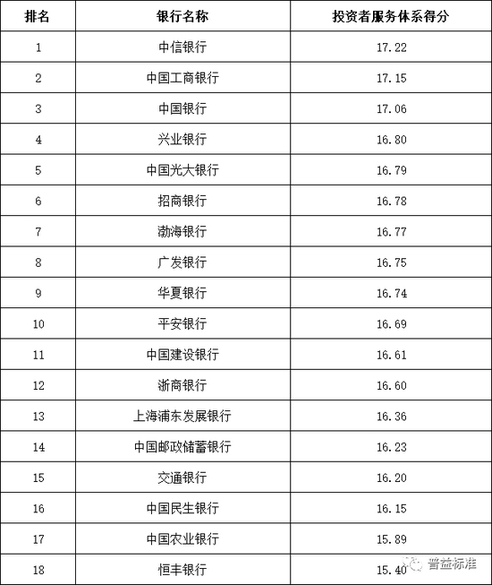 投资者服务体系:全国性银行排名前五的依次为中信银行、中国工商银行、中国银行、兴业银行和中国光大银行;城市商业银行排名前十的依次为宁波银行、南京银行、上海银行、青岛银行、江苏银行、杭州银行、徽商银行、北京银行、华融湘江银行和大连银行;农村金融机构排名前十的依次为广州农商银行、青岛农商银行、江苏江南农商银行、上海农商银行、重庆农商银行、江苏苏州农商银行、吉林九台农商银行、杭州联合农商银行、广东南海农商银行、浙江绍兴瑞丰农商银行。