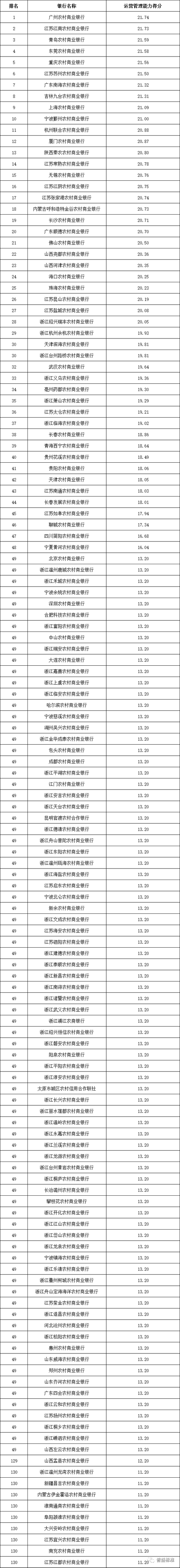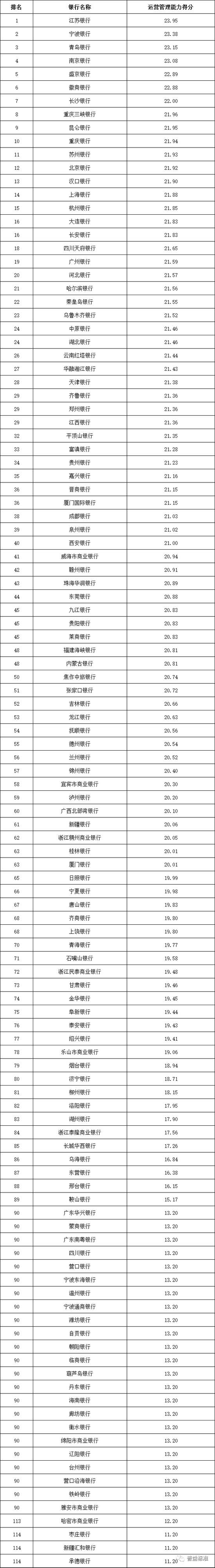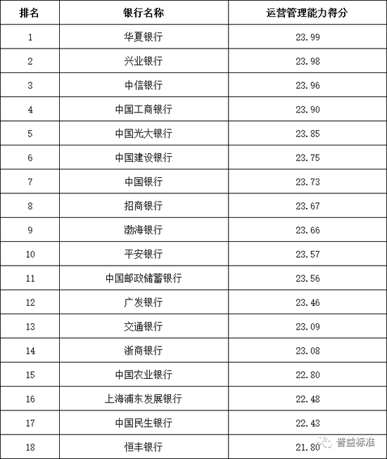 运营管理能力:全国性银行排名前五的依次为华夏银行、兴业银行、中信银行、中国工商银行和中国光大银行;城市商业银行排名前十的依次为江苏银行、宁波银行、青岛银行、南京银行、盛京银行、徽商银行、长沙银行、重庆三峡银行、昆仑银行和重庆银行;农村金融机构排名前十的依次为广州农商银行、江苏江南农商银行、青岛农商银行、东莞农商银行、重庆农商银行、江苏苏州农商银行、广东南海农商银行、吉林九台农商银行、上海农商银行和宁波鄞州农商银行。