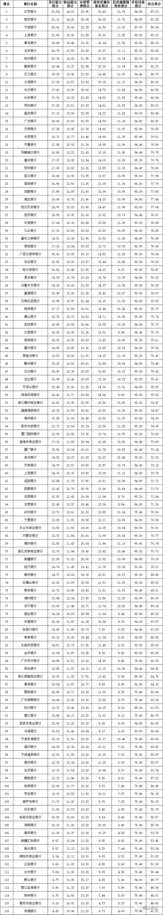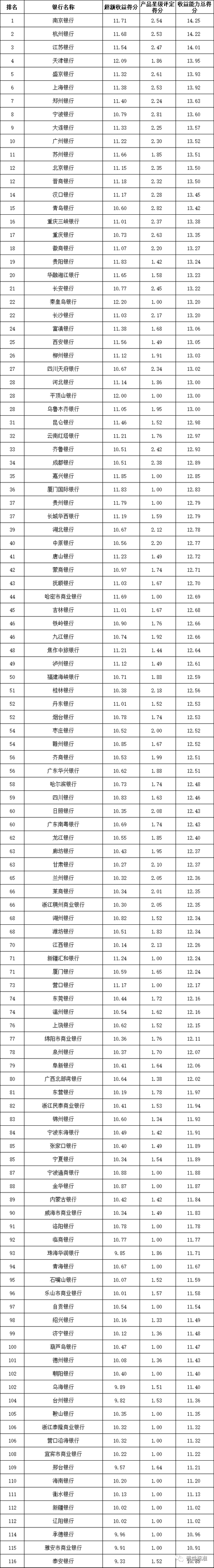 城市商业银行排名前十的依次为南京银行、杭州银行、江苏银行、天津银行、盛京银行、上海银行、郑州银行、宁波银行、大连银行、广州银行;
