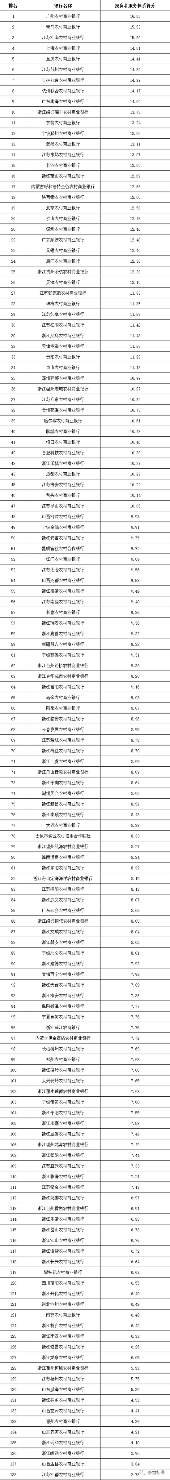 2021年2季度,农村金融机构中,投资者服务体系排名前十的银行依次为广州农商银行、青岛农商银行、江苏江南农商银行、上海农商银行、重庆农商银行、江苏苏州农商银行、吉林九台农商银行、杭州联合农商银行、广东南海农商银行、浙江绍兴瑞丰农商银行。