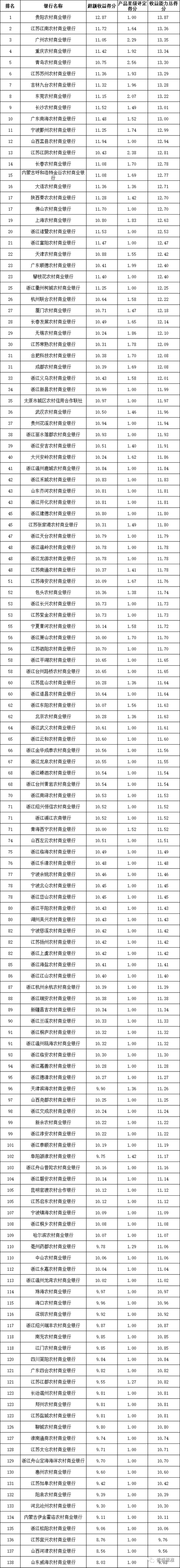 收益能力:全国性银行排名前五的依次为渤海银行、华夏银行、中国光大银行、兴业银行和中信银行;城市商业银行排名前十的依次为南京银行、杭州银行、江苏银行、天津银行、盛京银行、上海银行、郑州银行、宁波银行、大连银行、广州银行;农村金融机构排名前十的依次为贵阳农商银行、江苏江南农商银行、广州农商银行、重庆农商银行、青岛农商银行、江苏苏州农商银行、吉林九台农商银行、东莞农商银行、长沙农商银行和广东南海农商银行。