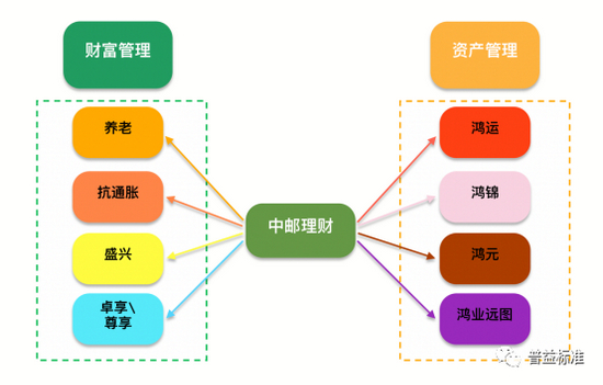在产品体系方面,中邮理财构建了“财富管理”+“资产管理”的双维度架构。在“财富管理”维度上,中邮理财着眼于客群的分类与分层,旨在突出对理财客户的需求细分和精准定位,设置了“养老”“抗通胀”“盛兴”等分类品牌和“卓享”“尊享”等分层品牌。在“资产管理”维度上,中邮理财侧重于资金投向与资产配置,旨在突显理财投资的投研驱动和价值挖掘,推出纯固收类“鸿运”、固收+“鸿锦”、偏固收混合类“鸿元”及私募产品“鸿业远图”等八大产品系列。