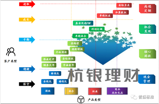 中银理财于2019年7月4日正式开业,该理财子公司布局了7大核心产品系列,分别是“稳富”公募固收系列(稳富“福、禄、寿、禧”,分别针对中老年、中青年、老年、青年客户群),“智富”权益系列、“鼎富”股权投资系列以及指数系列,另加“乐享”现金管理系列,“睿富”非标债权系列,“稳享”私募固收系列、“全球配置”外币系列。