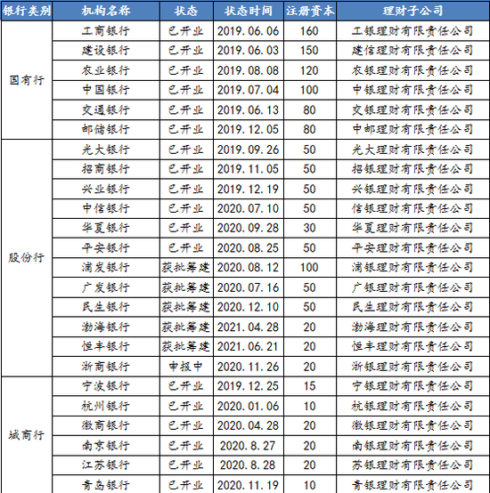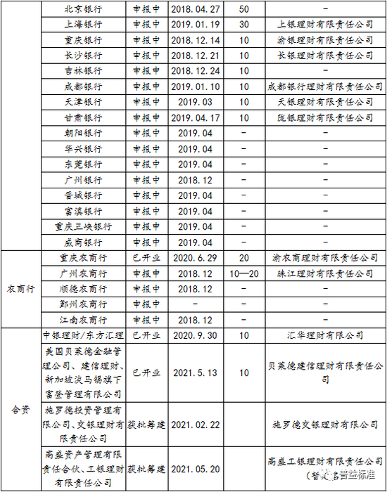 截至2021年6月,据公开资料显示,已有49家机构申请设立理财子公司,其中银行45家,中外合资机构4家。同时,这49家机构中,21家机构已正式开业,7家机构获批筹建理财子公司,其余21家机构尚待批复。
