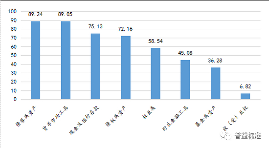 低风险资产占据主导,债券类资产、货币市场工具和现金存款占比较高。一直以来,由于银行理财客群对于低风险、稳健型产品的偏好,银行理财主要投向债券和非标资产,而在银行理财净值化转型背景下,出于稳定客群、平滑产品净值波动的诉求,银行机构依然主打固收类产品,这使得存款、债券等债权类资产在目前银行资金投向中占据较高比重。截至2019年末,非保本理财穿透各类资管产品后持有资产余额26.24万亿元。其中,存款、债券及货币市场工具的余额占非保本理财产品投资余额的71.75%,同比上升5.48个百分点。债券是理财产品重点配置的资产之一,在理财资金投资各类资产中占比最高,达到59.72%,同比上升6.37个百分点。在投向存款、债券及货币市场工具的占比上升的同时,理财资金投资非标准化债权类资产及权益类资产的占比同比分别下降1.79和2.32个百分点[4]。