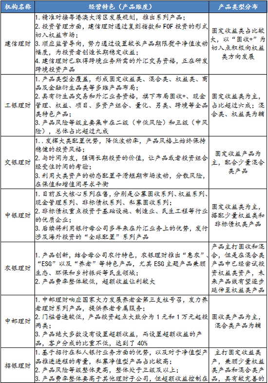 截至2021年6月,已开业的21家理财子公司在原有银行理财产品基础上,根据母行优势经营领域,完善和扩展了产品体系及产品线。其中:建信理财、招银理财均于深圳市注册成立,依托粤港澳大湾区战略发展,推出相关系列产品;中银理财在外币投资领域具有相对优势;兴银理财、杭银理财、渝农商理财分别继承母行特色经营理念,展开特色经营路线。