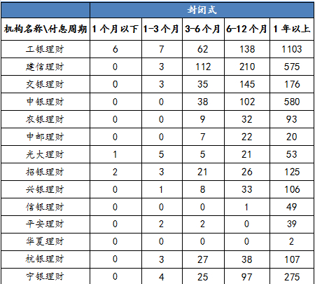 注:由于部分理财子公司正在开展产品迁移,部分迁移后的理财子公司封闭式产品离产品到期日较近,因而产品付息期低于1个月