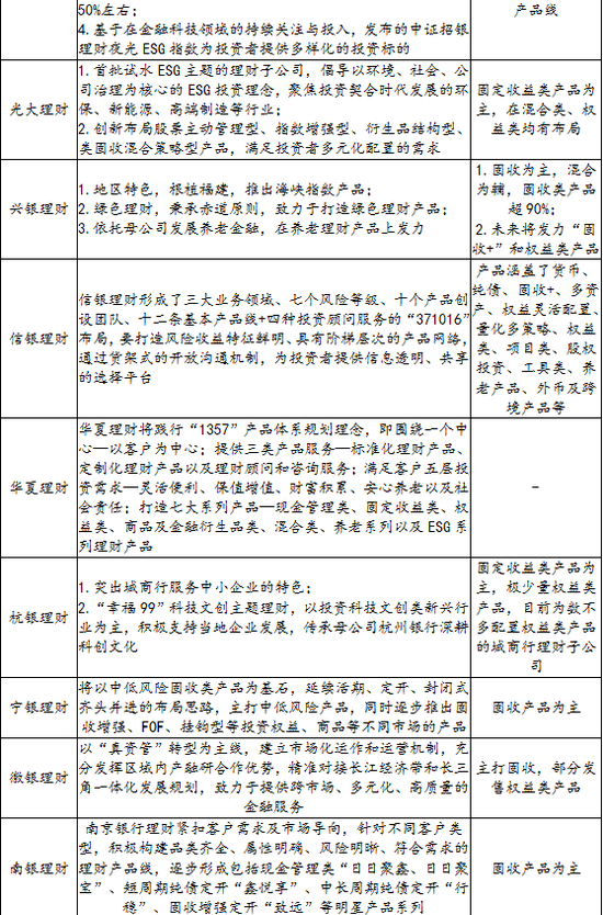 在产品线布局上兴银理财倾向于全能型,将理财产品线分为“八大核心”,分别包括了现金管理、纯债投资、固收增强、项目投资、股债混合、权益投资、多资产策略、跨境投资在内的主流产品线类型,致力于打造客户类型和市场投资全覆盖的产品框架,构建资管生态圈。截至2021年6月,兴银理财已发售了包含固收和混合类产品在内的495款产品。