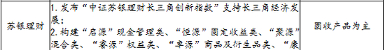 在产品体系方面,苏银理财与复旦大学中国社会主义市场经济研究中心、中证指数有限公司联合发布了“中证苏银理财长三角创新指数”,有助于反映长三角新经济发展趋势和创新活跃度,为全球投资者支持长三角发展提供标准化投资工具。除了特色产品以外,苏银理财常规产品内涵丰富。苏银理财围绕“源”文化,构建“启源”现金管理类、“恒源”固定收益类、“聚源”混合类、“睿源”权益类、“卓源”商品及衍生品类、“康源”特色养老类六大产品体系,为企业和个人多元化、多层次的投资需求提供特色化、差异化、专业化的金融服务,为老百姓打理财富“谋福祉”的同时,积极为实体经济转型升级“添动力”,真正做到“惠民助企、直达实体”。截至2021年6月,苏银理财已发售包括固收类和混合类产品在内的217只产品。