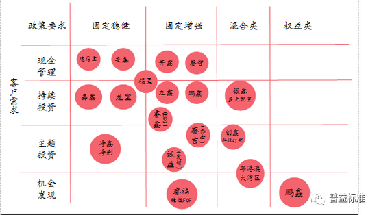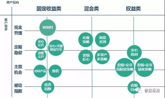 面对激烈的市场竞争,农银理财子公司在发展之初即梳理了自身在客户、资金以及渠道等方面的比较优势和能力边界;与此同时,农银理财对标监管要求,推进产品净值化转型,积极服务实体经济,满足客户多样化的理财需求,在开业之初即推出“现金管理+固收+混合+权益”4大常规产品体系,并随着理财子公司的发展,逐步涵盖到商品外汇和另类投资。特别的,在6类常规产品的基础上,结合农行特色,农银理财也逐步推出“惠农”、“ESG”以及“养老”等特色产品。截至2021年6月,农银理财已经发布了覆盖固收和混合类产品在内的334款产品。